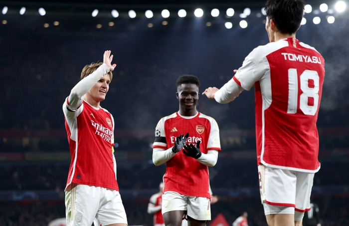Arsenal er komið áfram í 16-liða úrslit og búið að vinna riðilinn, en liðið tekur PSV með sér. PSV er í öðru sæti með 8 stig, þremur meira en Lens, en Lens getur ekki endað fyrir ofan PSV vegna innanbyrðisviðureigna.