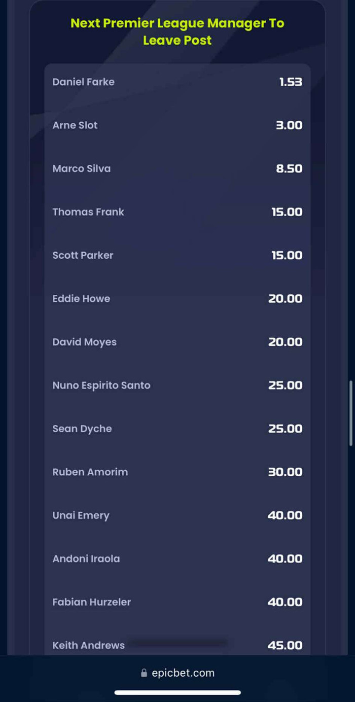 Á Epicbet er hægt að sjá hvaða stjórar í úrvalsdeildinni eru líklegastir til að fá sparkið og Slot er sá næstlíklegasti. Einungis Daniel Farke hjá Leeds er líklegri.