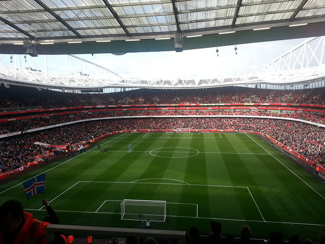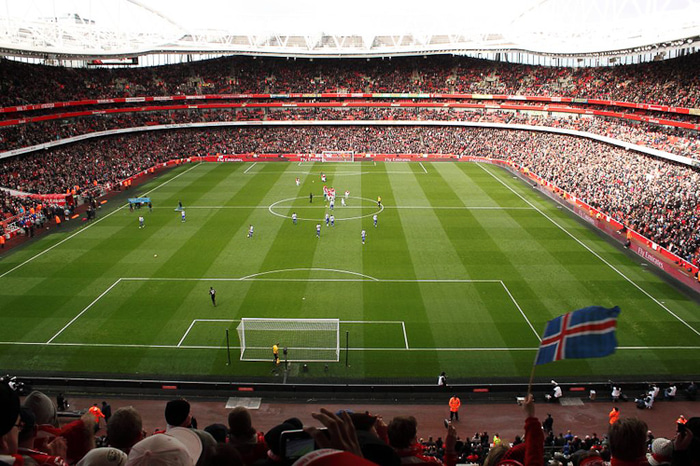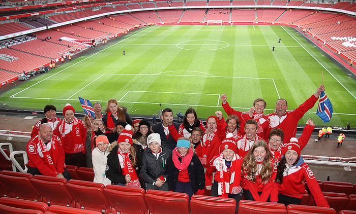 Við fengum sæti fyrir aftan markið á Emirates leikvangnum sem er svo vel hannaður að öll sæti virðast vera góð sæti. Fyrir leikinn var myndavélinni beint að Íslendingunum og varpað á stóran skjá á vellinum og þakkað fyrir komuna.