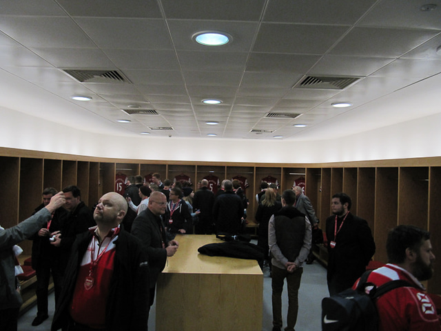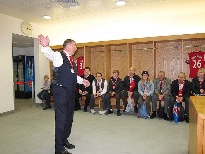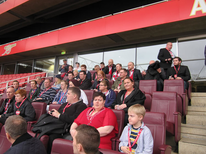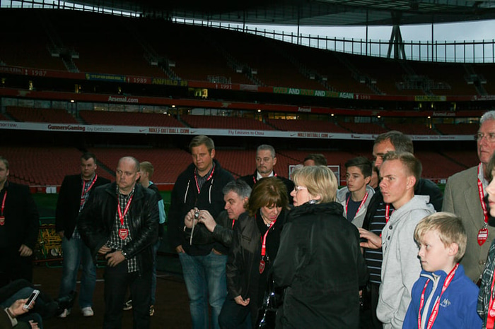 Þegar þangað var komið fékk hópurinn að fara í skoðunarferð um leikvanginn sem er einn glæsilegasti leikvangur heims, ef ekki sá glæsilegasti. Fulltrúar félagsins gengu þá með okkur í litlum hópum um allan leikvanginn og sýndu okkur allt. Bílastæði leikmanna, VIP stúkuna og matsalinn sem Arsene Wenger notar þegar hann er ekki niðri við völlinn, búningsklefana, varamannabekkina og allt.