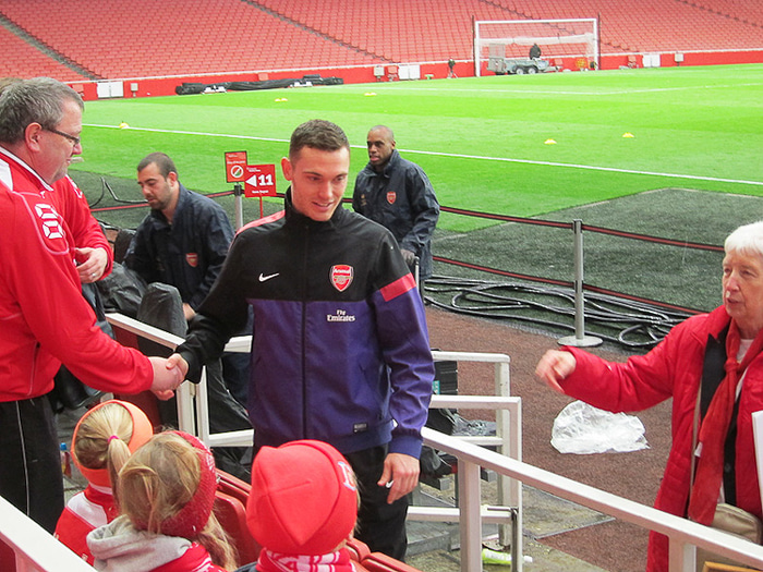 Hópurinn var eftir leik beðinn um að bíða í sætunum á meðan leikvangurinn tæmdist, en gekk svo fylktu liði niður og fékk sæti fyrir aftan varamannabekk Arsenal. Þar var tekið á móti okkur og Thomas Vermaelen heilsaði upp á mannskapinn. Arteta mætti svo óvænt sjálfur og heilsaði Íslendingunum áður en hann fór í sturtu.