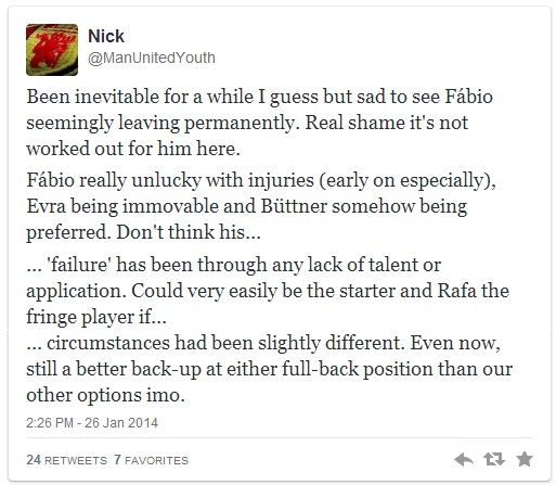 ManUnitedYouth er twitter-síða stuðningsmanns United sem fylgist grannt með gangi mála hjá varaliðinu og yngri liðunum. Hann hafði þetta að segja um brottför Fabio (sjá til hliðar)