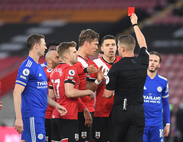 Jannik Vestergaard, miðverði Southampton, var vikið af velli á 10. mínútu leiks Southampton og Leicester sem nú er í gangi.