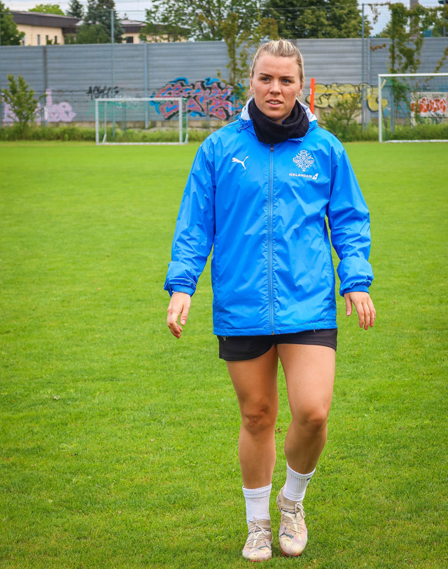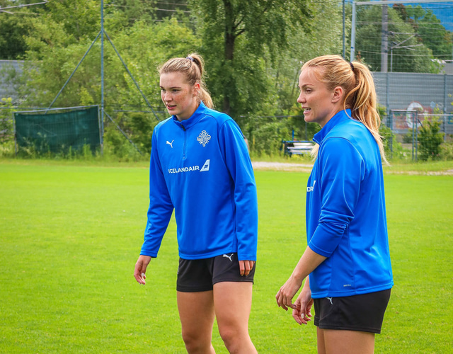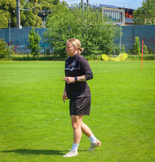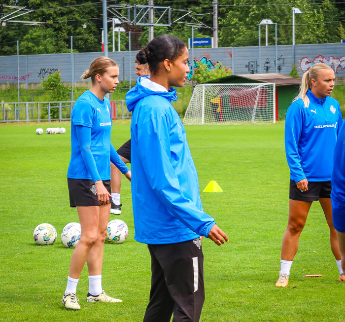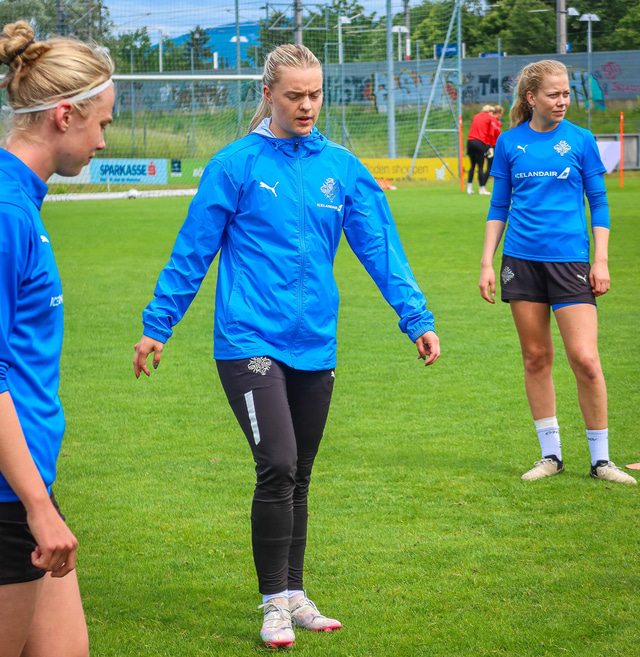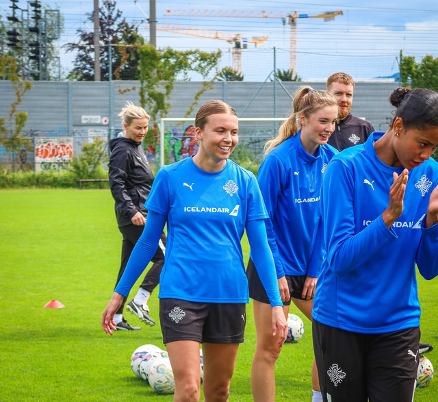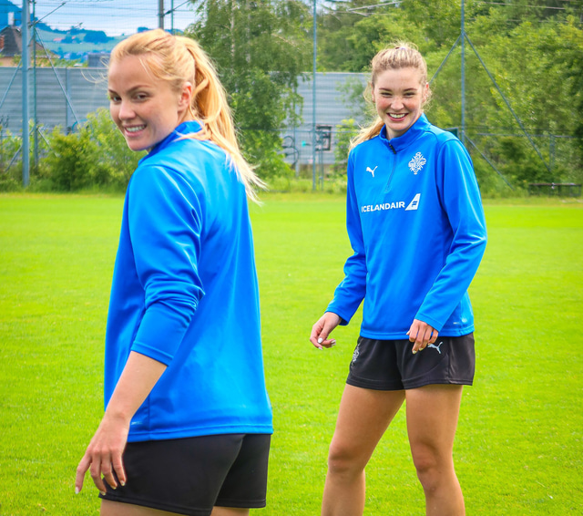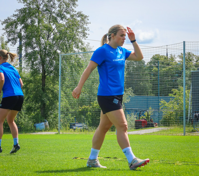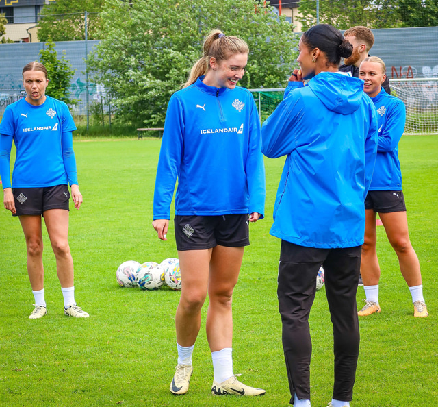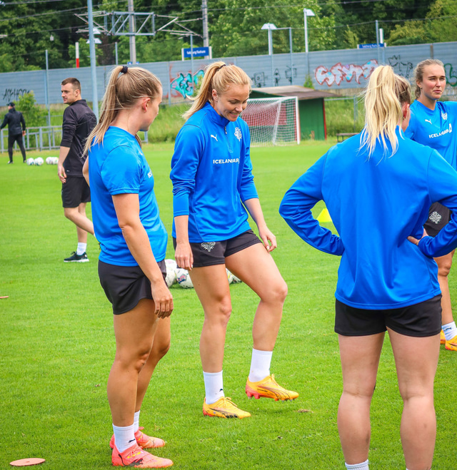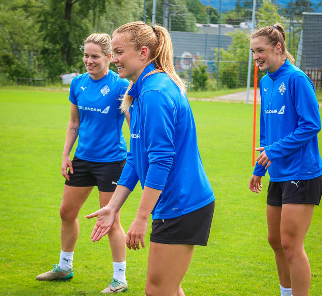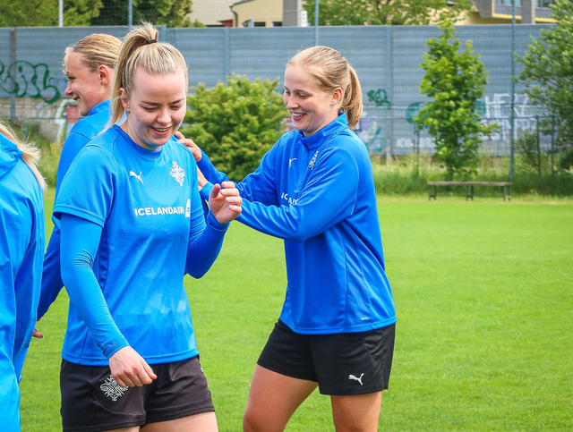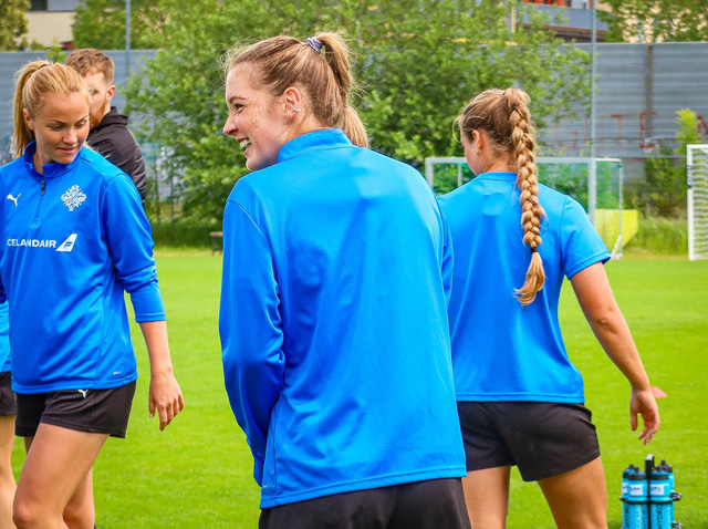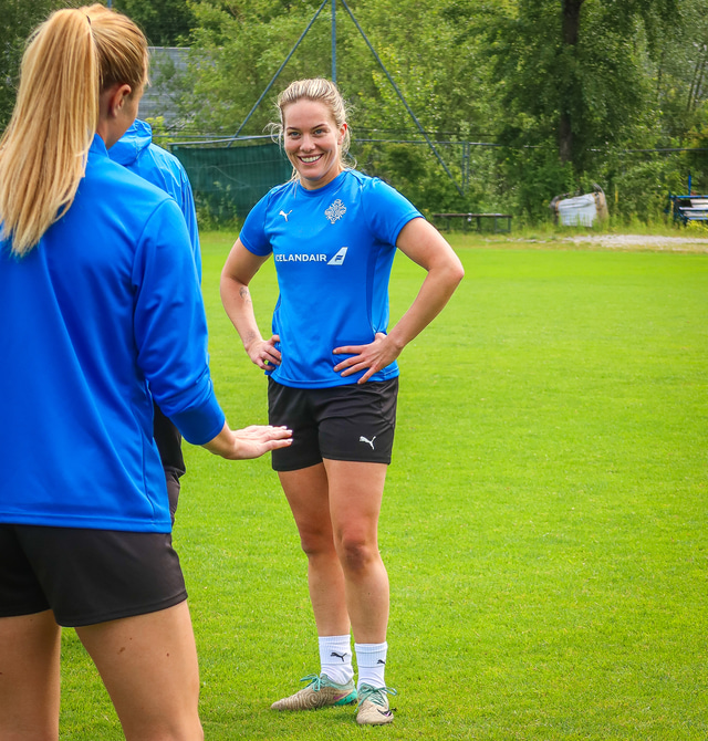 Karólína Lea tók undir með Glódísi að það væri býsna góð stemning í hópnum. „Við erum allar mjög nánar og það er alltaf gaman að koma saman. Maður þarf alltaf að 'blasta' þessum hátalara í hvert skipti sem við löbbum hérna fram hjá. Ég reyni að forðast að sjá um lagavalið. Það eru alltaf einhver skipti en ég er alltaf mjög sátt með tónlistina," sagði Karólína og brosti.
