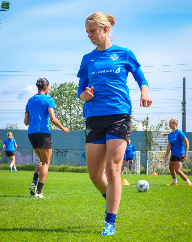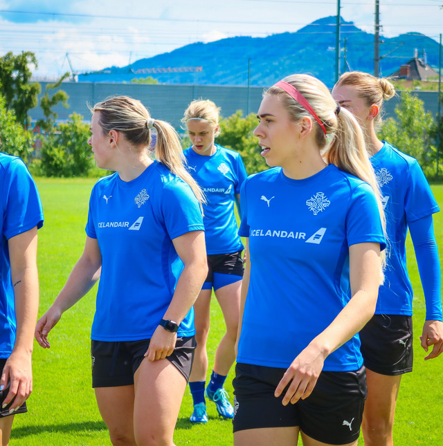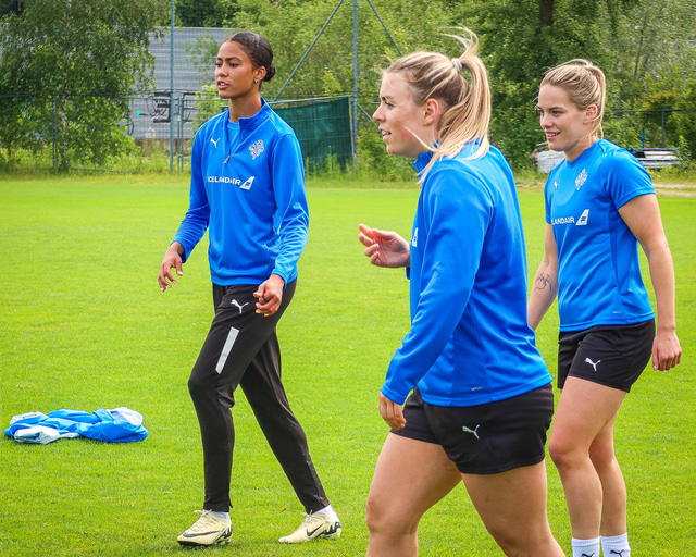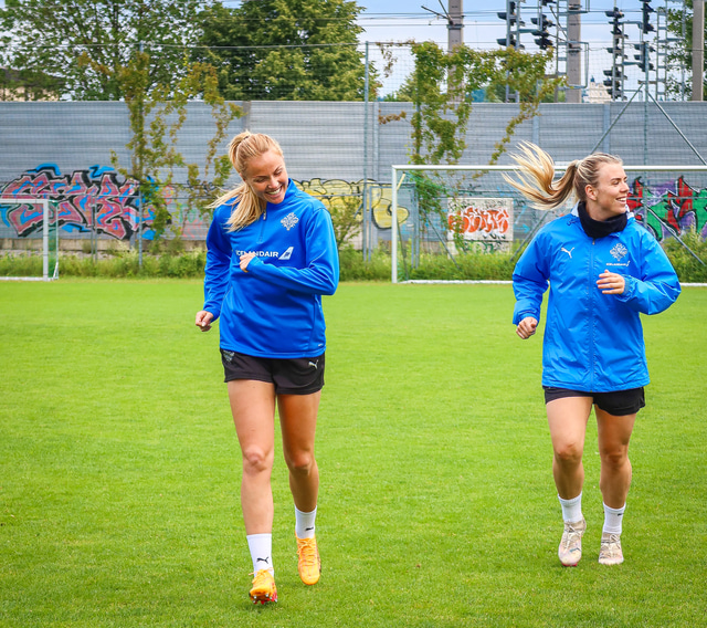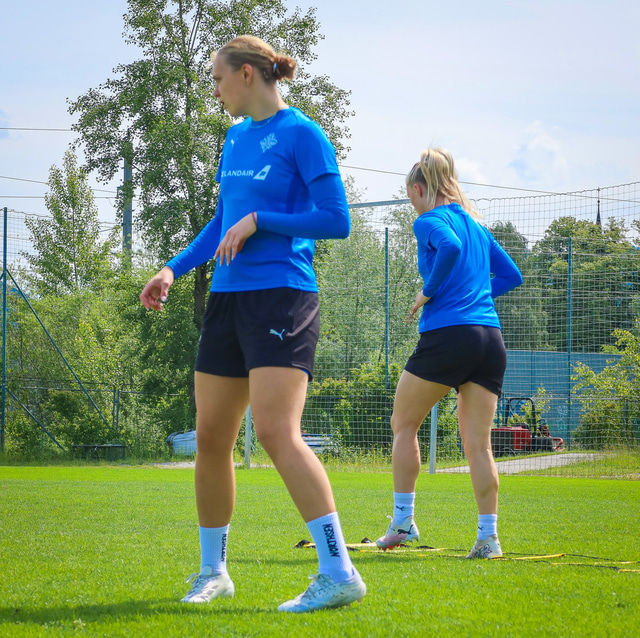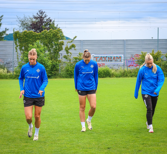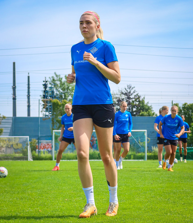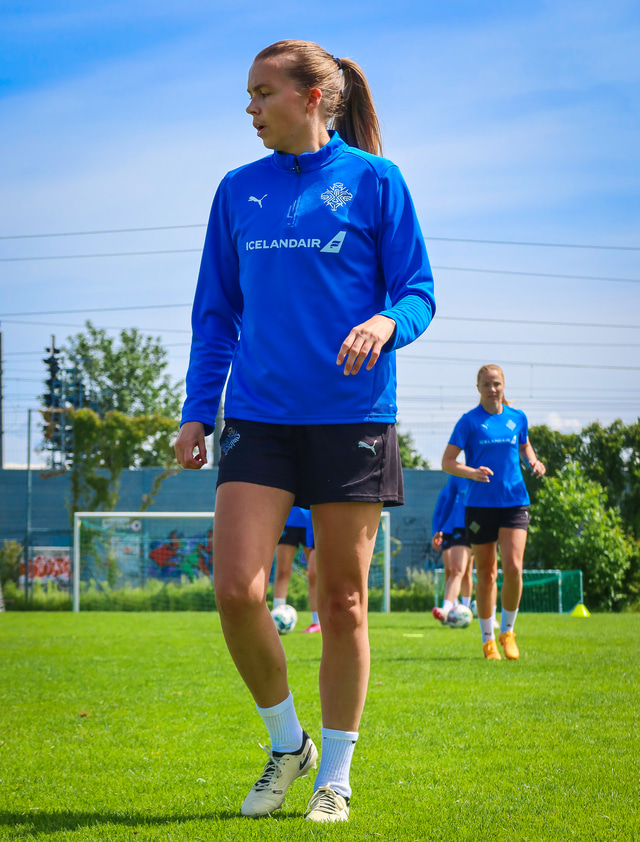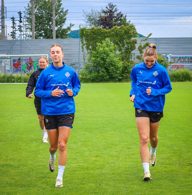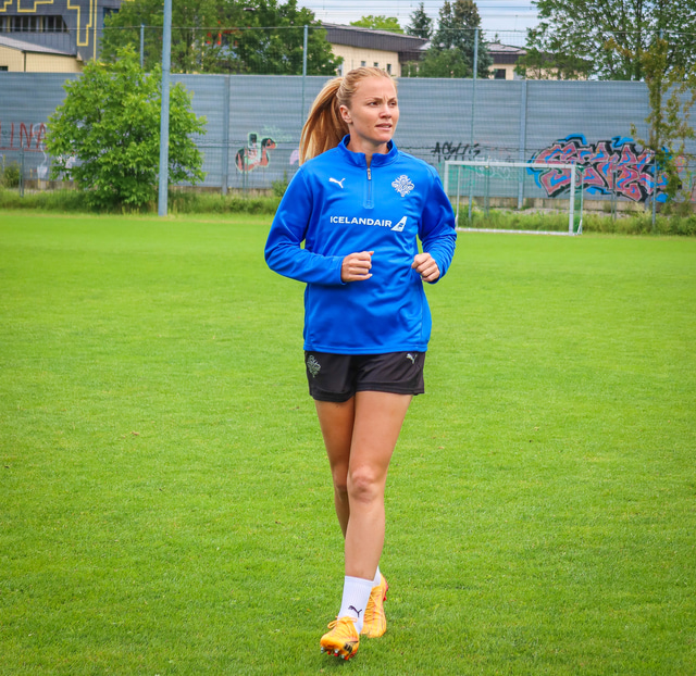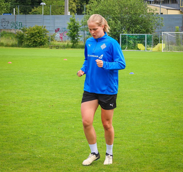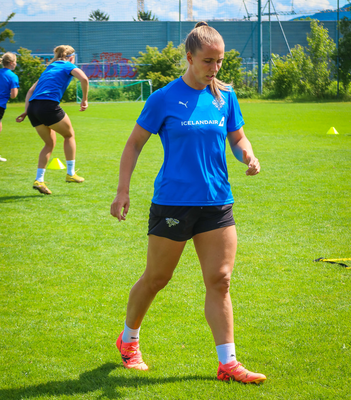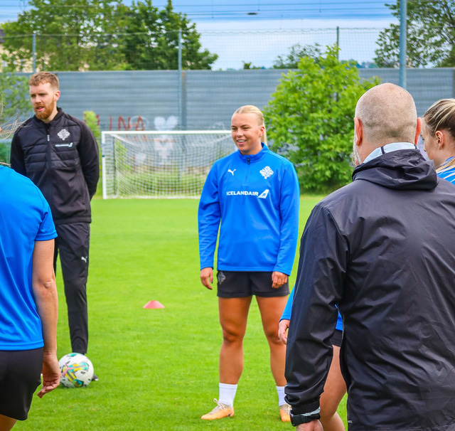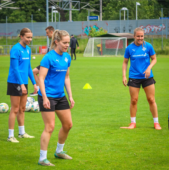 Karólína Lea tók undir með Glódísi að það væri býsna góð stemning í hópnum. „Við erum allar mjög nánar og það er alltaf gaman að koma saman. Maður þarf alltaf að 'blasta' þessum hátalara í hvert skipti sem við löbbum hérna fram hjá. Ég reyni að forðast að sjá um lagavalið. Það eru alltaf einhver skipti en ég er alltaf mjög sátt með tónlistina," sagði Karólína og brosti.