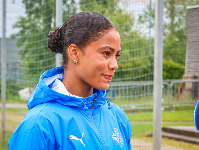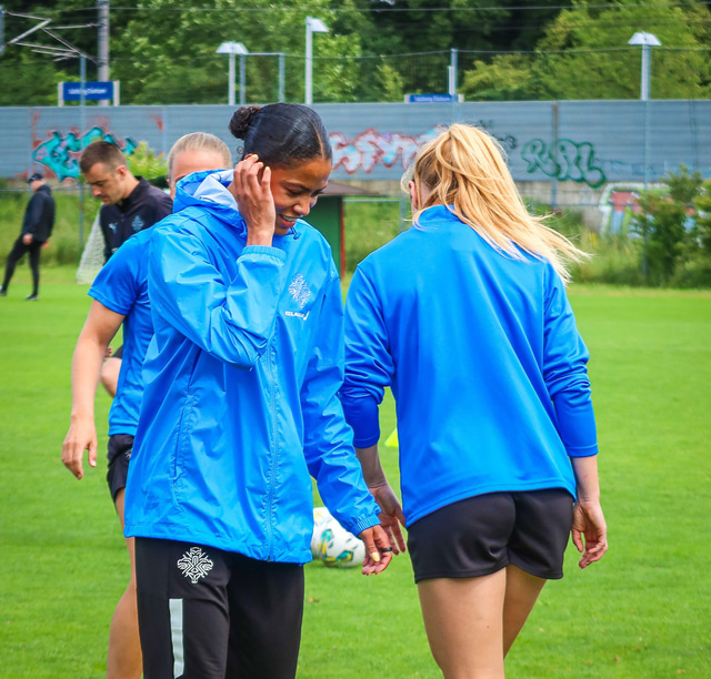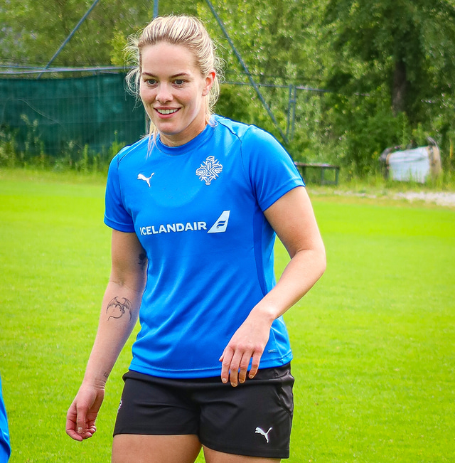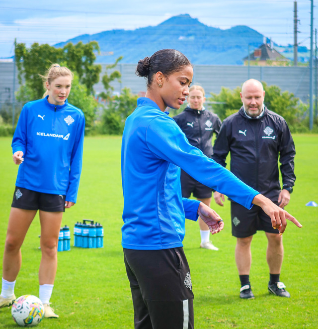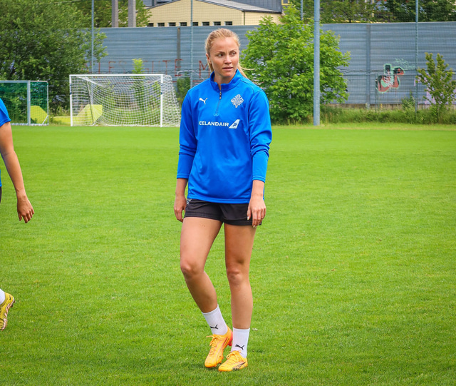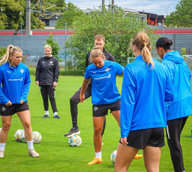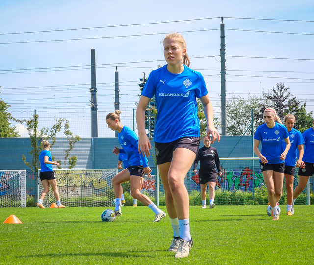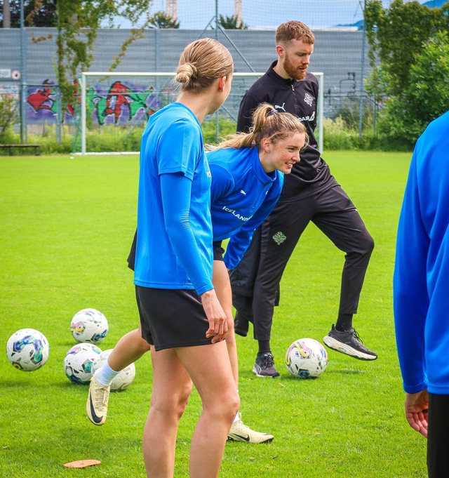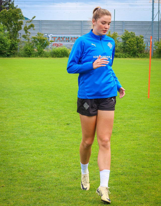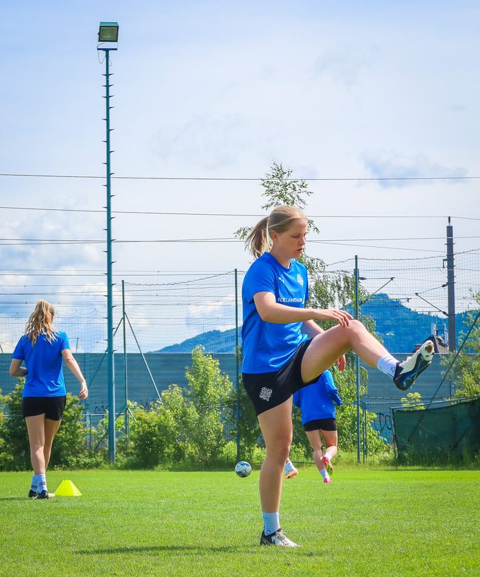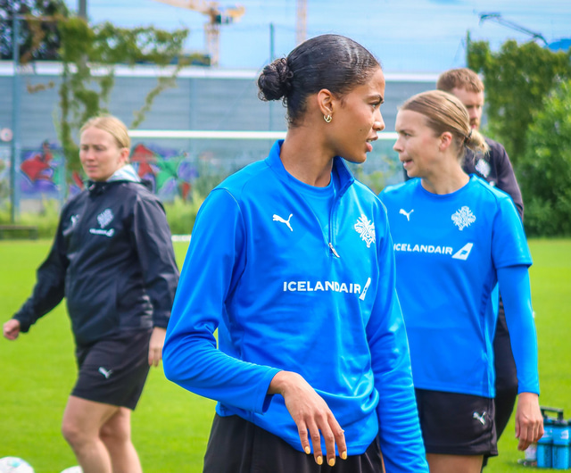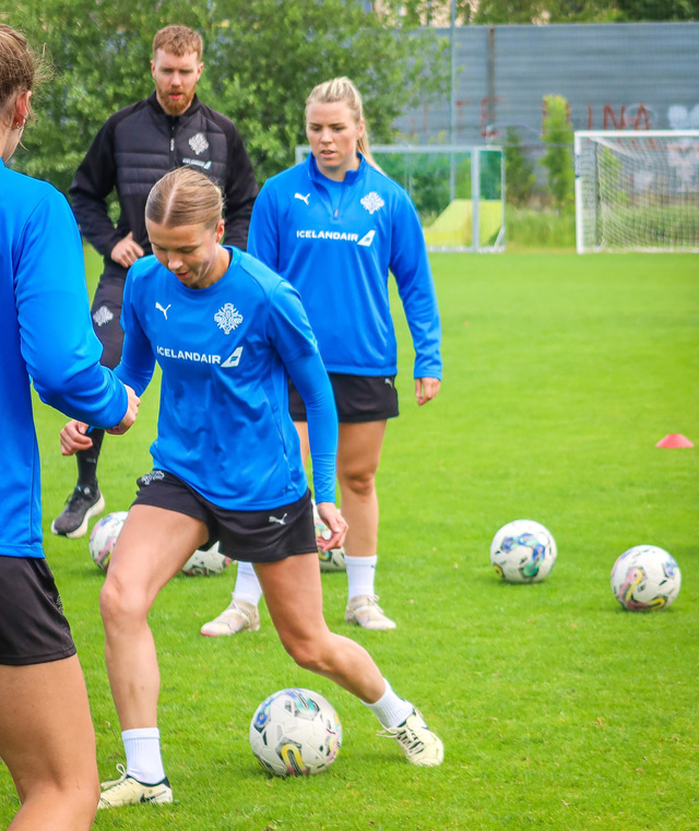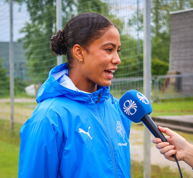 Karólína Lea tók undir með Glódísi að það væri býsna góð stemning í hópnum. „Við erum allar mjög nánar og það er alltaf gaman að koma saman. Maður þarf alltaf að 'blasta' þessum hátalara í hvert skipti sem við löbbum hérna fram hjá. Ég reyni að forðast að sjá um lagavalið. Það eru alltaf einhver skipti en ég er alltaf mjög sátt með tónlistina," sagði Karólína og brosti.