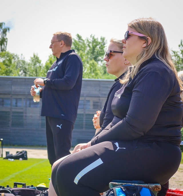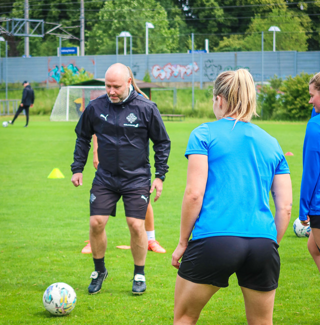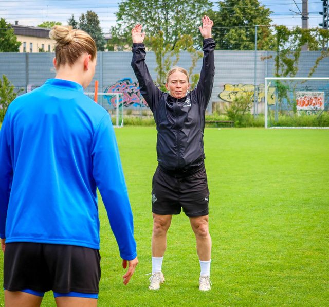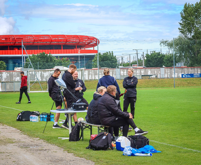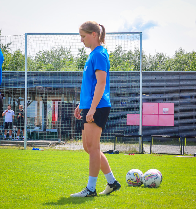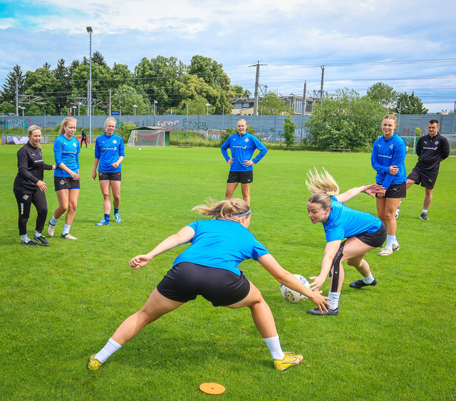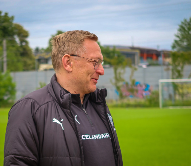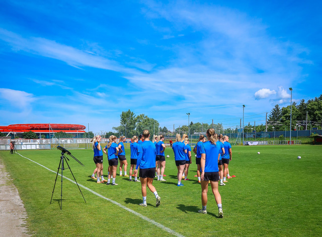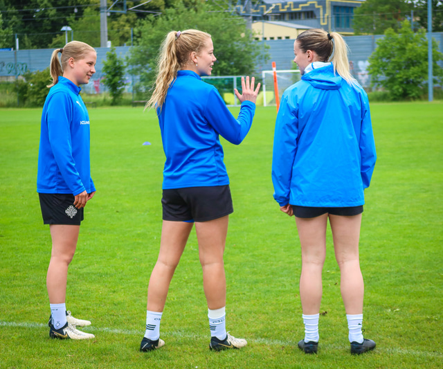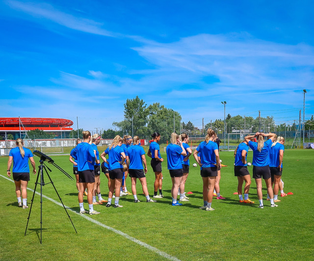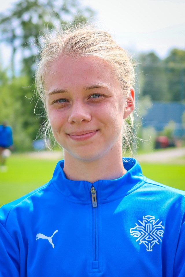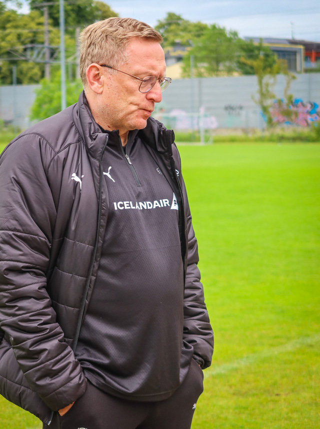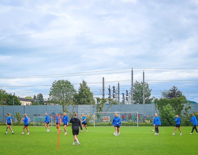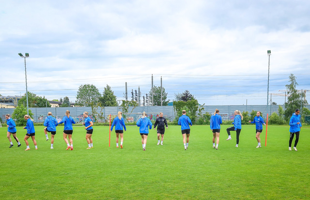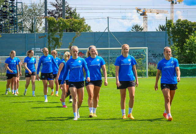 Karólína Lea tók undir með Glódísi að það væri býsna góð stemning í hópnum. „Við erum allar mjög nánar og það er alltaf gaman að koma saman. Maður þarf alltaf að 'blasta' þessum hátalara í hvert skipti sem við löbbum hérna fram hjá. Ég reyni að forðast að sjá um lagavalið. Það eru alltaf einhver skipti en ég er alltaf mjög sátt með tónlistina," sagði Karólína og brosti.