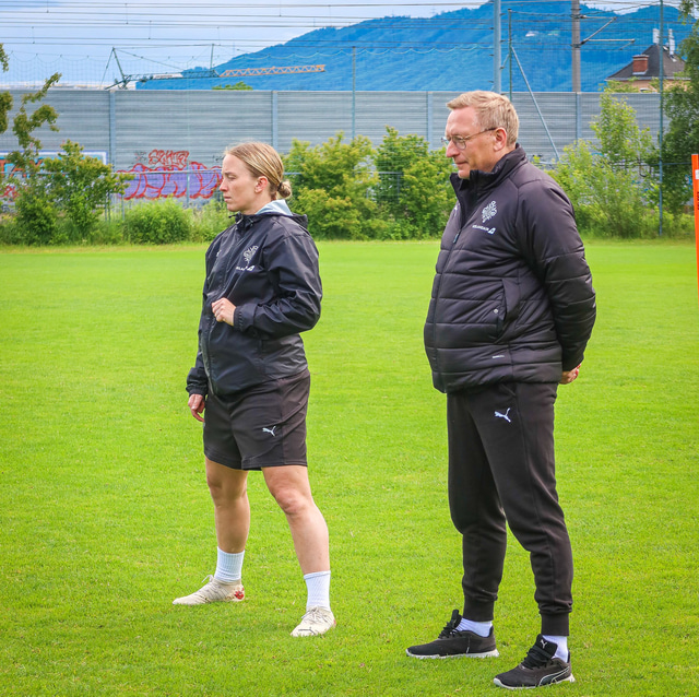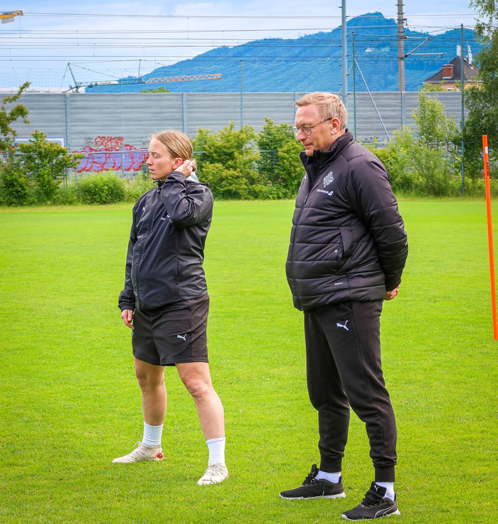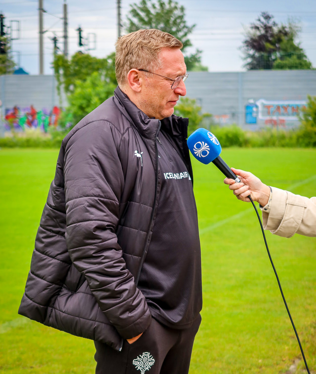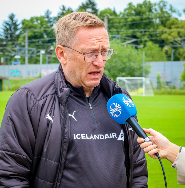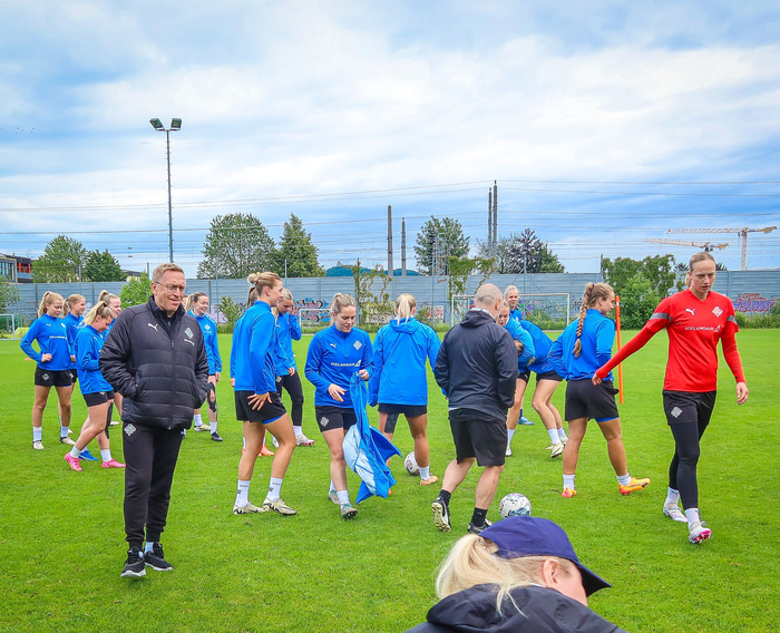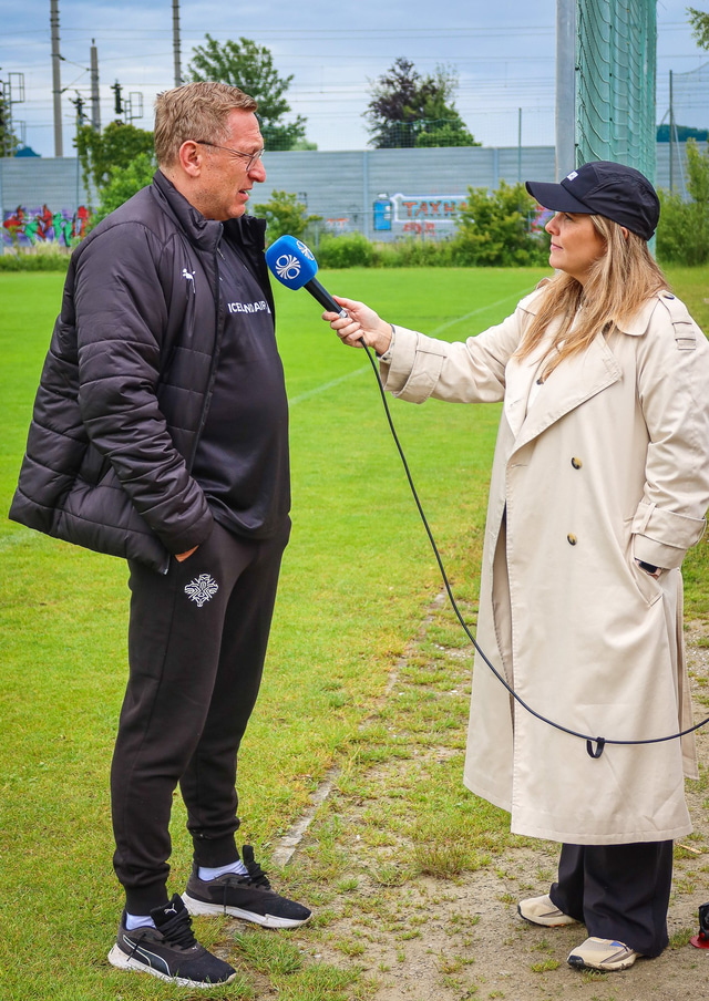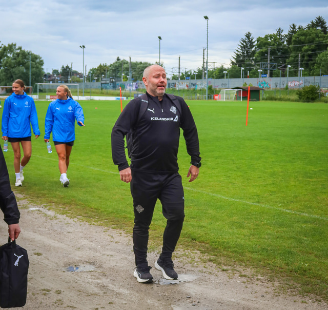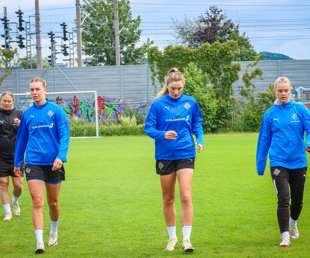 Karólína Lea Vilhjálmsdóttir hélt á stórum hátalara þegar liðið mætti inn á æfingasvæðið í Salzburg í morgun. Vangaveltur með Herra Hnetusmjör var spilað hátt og svo var farið beint yfir í Prada með Raye.
