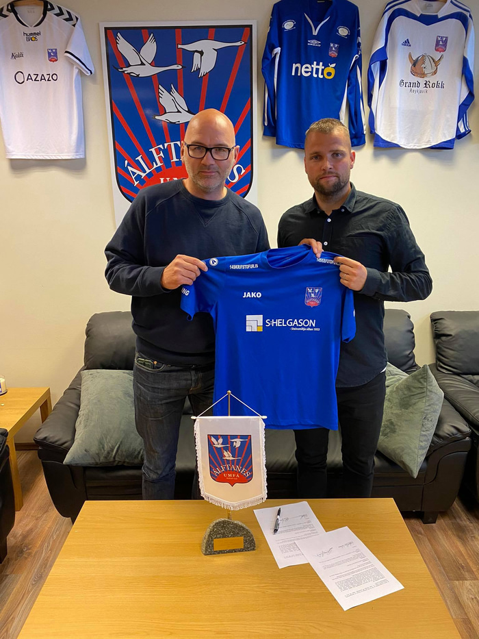 Gunnlaugur Jónsson, nýr þjálfari, og Guðjón Pétur Lýðsson fyrir hönd Álftanes. Þess má geta að Guðjón spilaði fyrir Stjörnuna í bikarsigri á Víkingi í kvöld.