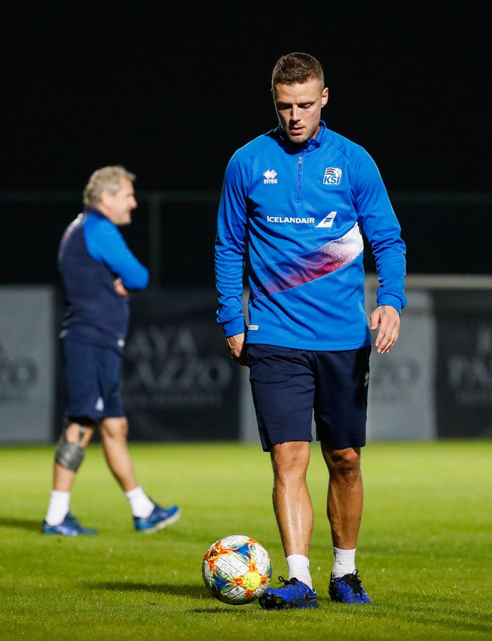 „Það er ein æfing búin hjá honum, ein æfing og einn fundur. Hann hefur tekið 100 prósent þátt í því. Hann er kominn af stað í þetta og ég á ekki von á öðru en að það verði góð viðbót. Við vorum í vandræðum varðandi það að fá mörk á okkur og þá er bara gott að fá besta varnarmann (Íslands)sögunnar í teymið."