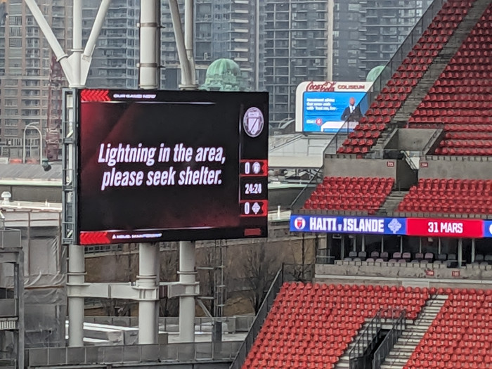 Haítí og Ísland eru að fara að mætast í vináttulandsleik sem átti að hefjast 16:30 í Toronto í Kanada. Ljóst er að það verða tafir á því að leikurinn verði flautaður á.
