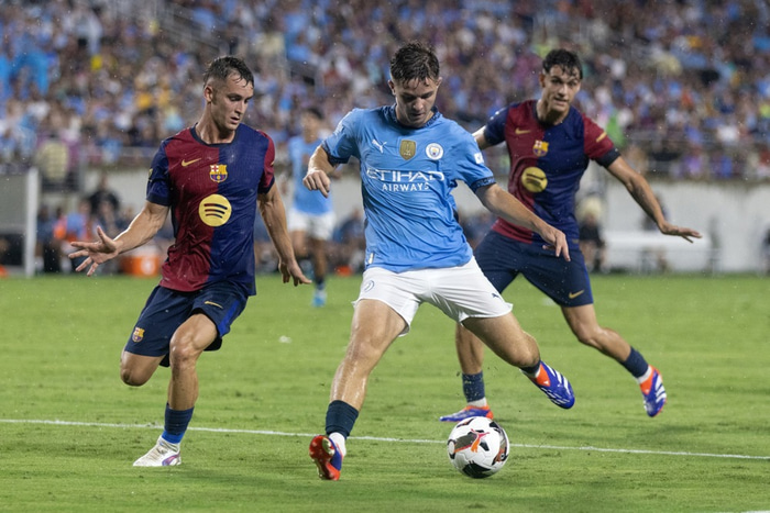 Pau Victor kom Barcelona yfir áður en enski unglingalandsliðsmaðurinn Nico O'Reill, sem er 19 ára, jafnaði. Pablo Torre endurheimti forystuna fyrir Barcelona en Grealish jafnaði í 2-2.