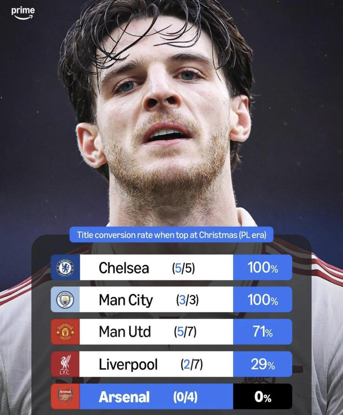 Núna er staðan þó önnur og sagan er ekki með Arsenal í liði. Þetta er í fimmta sinn frá stofnun úrvalsdeildarinnar sem Arsenal er í toppsætinu yfir jólatímann, en aldrei hefur félaginu tekist að vinna deildina þegar það gerist. Félagið hefur þrisvar sinnum unnið úrvalsdeildina en aldrei eftir að hafa verið á toppinum um jólin.